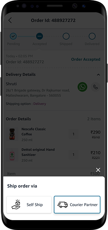 - Select either self-ship or courier partner for delivering the order.