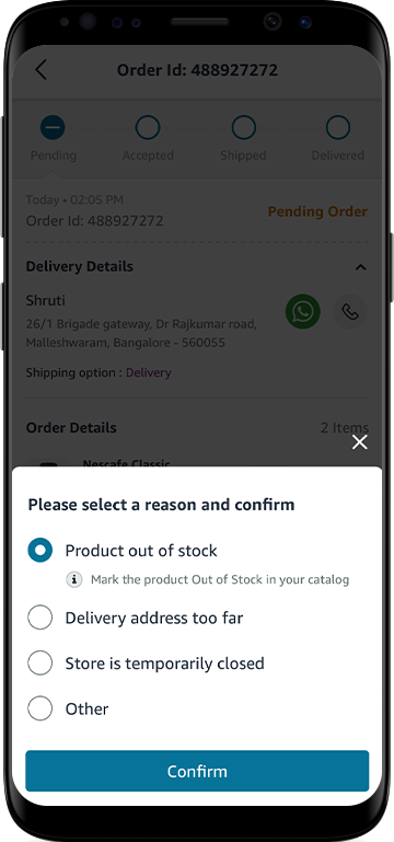 - Click on the ‘Confirm’ button to reject the order.
